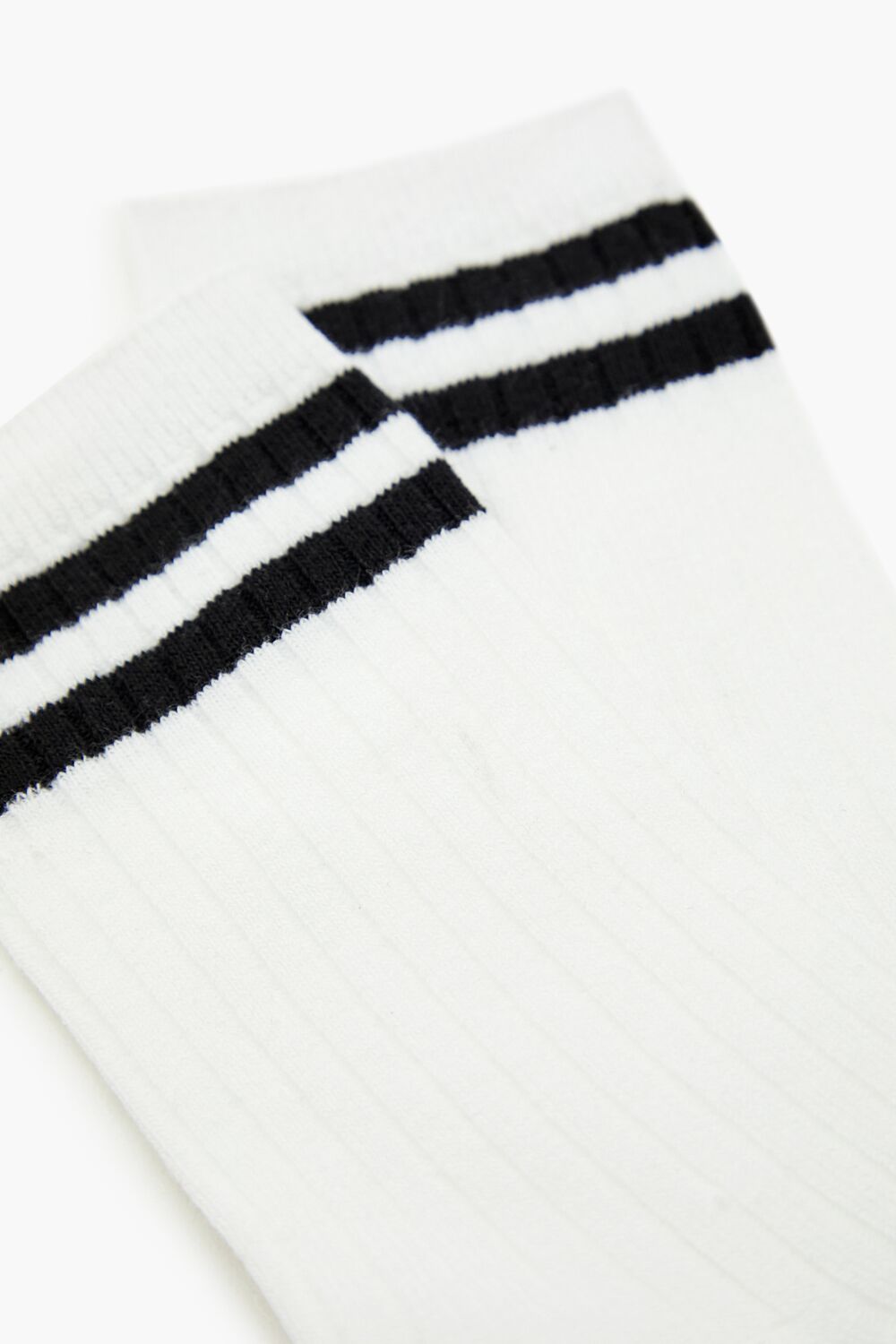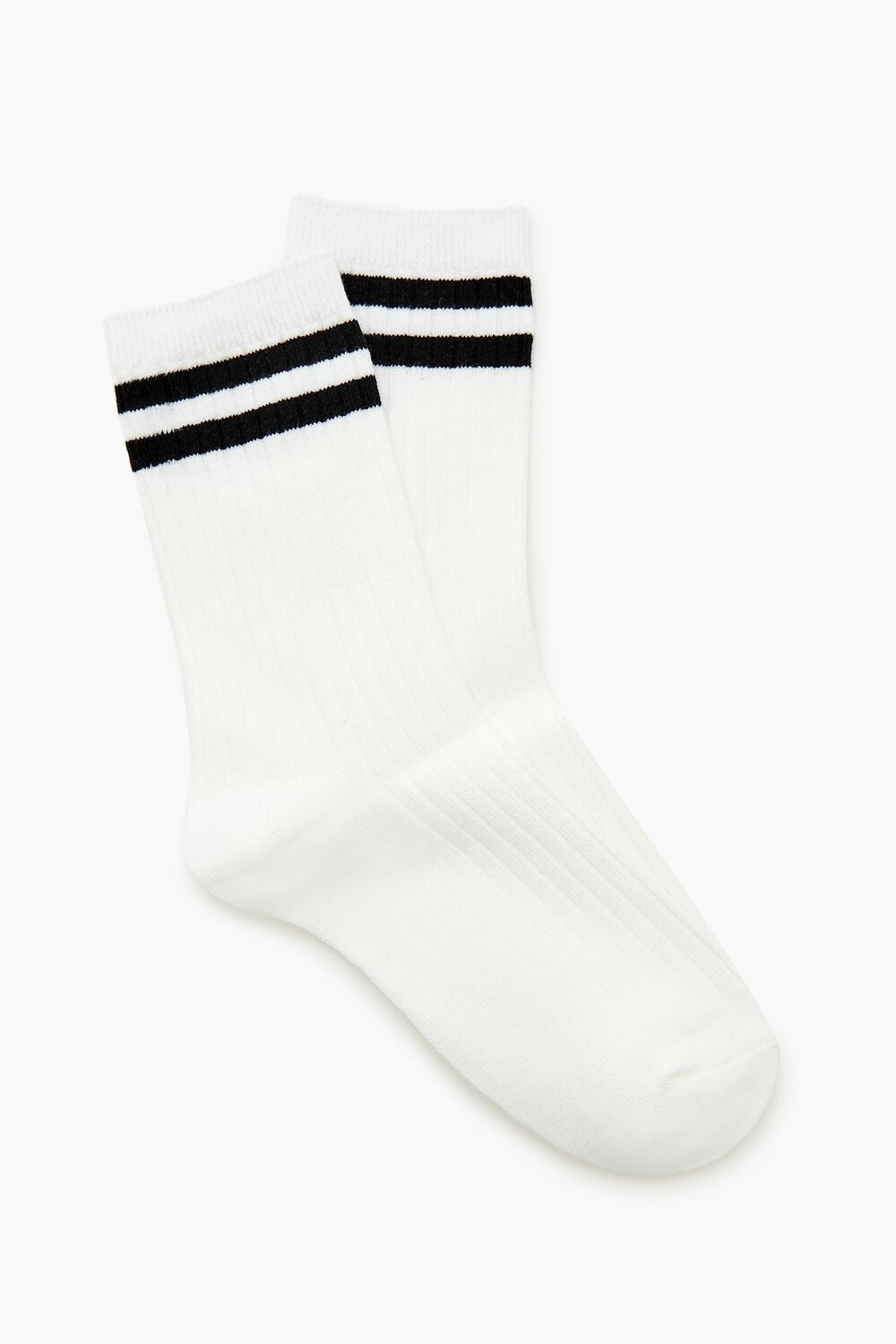 A pair of ribbed knit crew socks featuring contrasting varsity-striped trim.