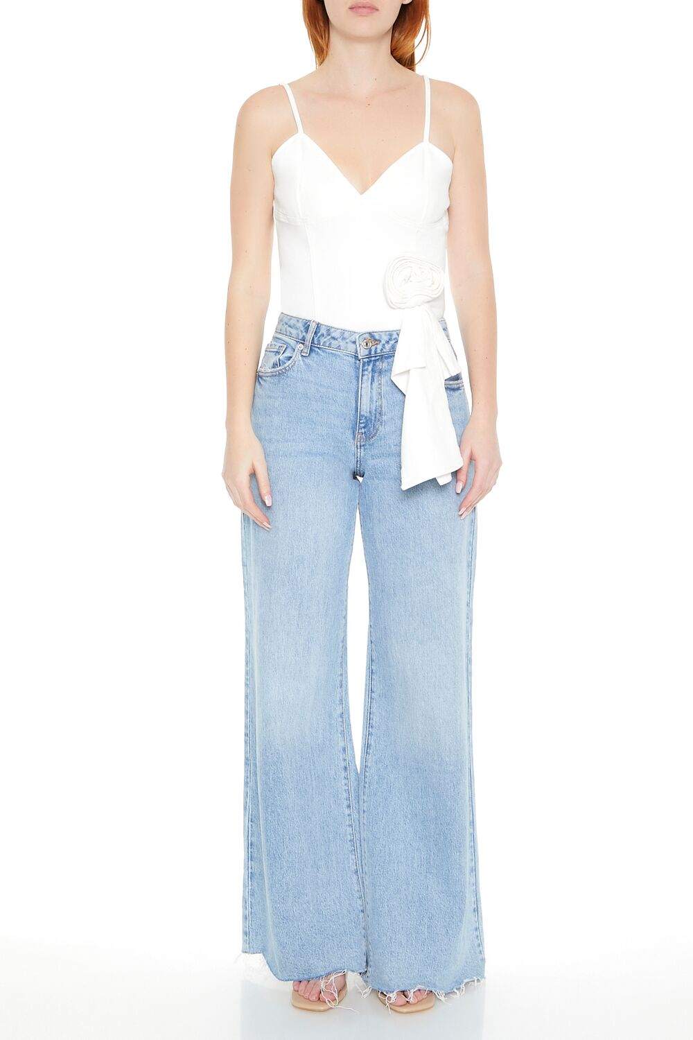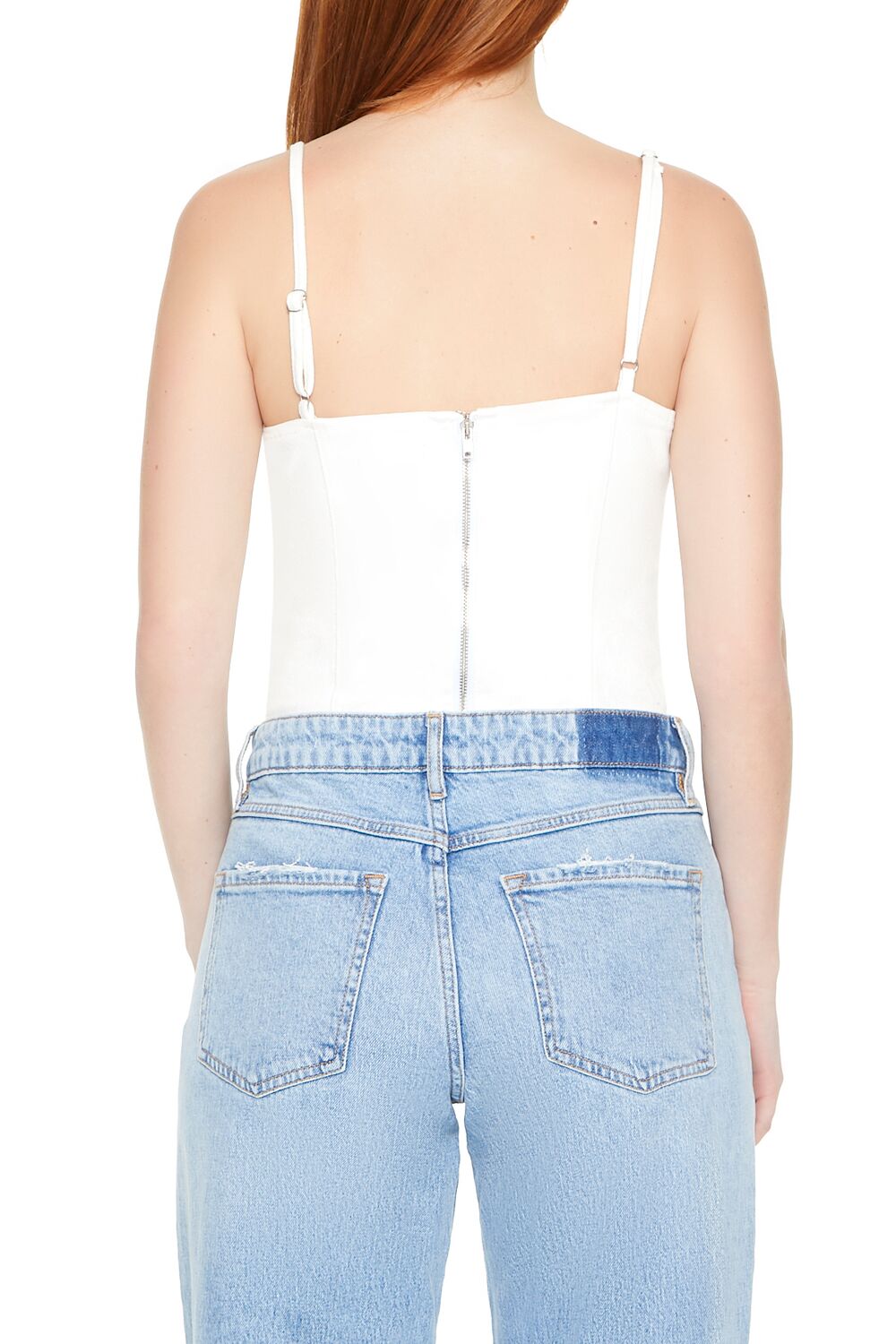 Crafted from non-stretch denim. this bodysuit features a V-neckline. adjustable cami straps. rosette and sash embellishments. straight-cut back. and an exposed back zipper closure.