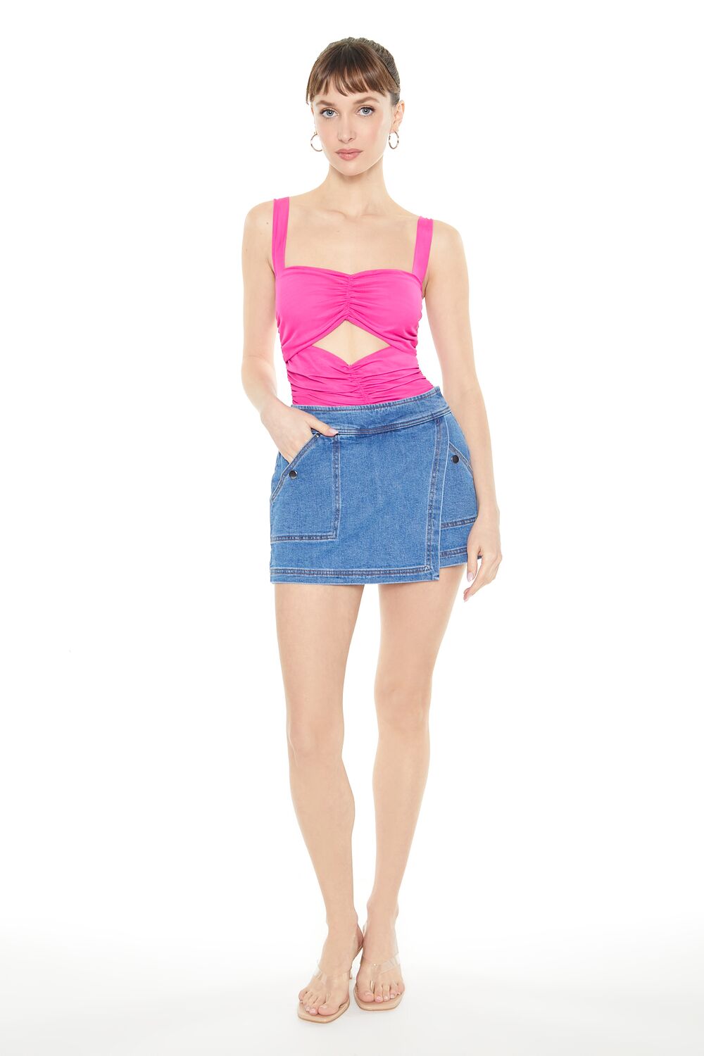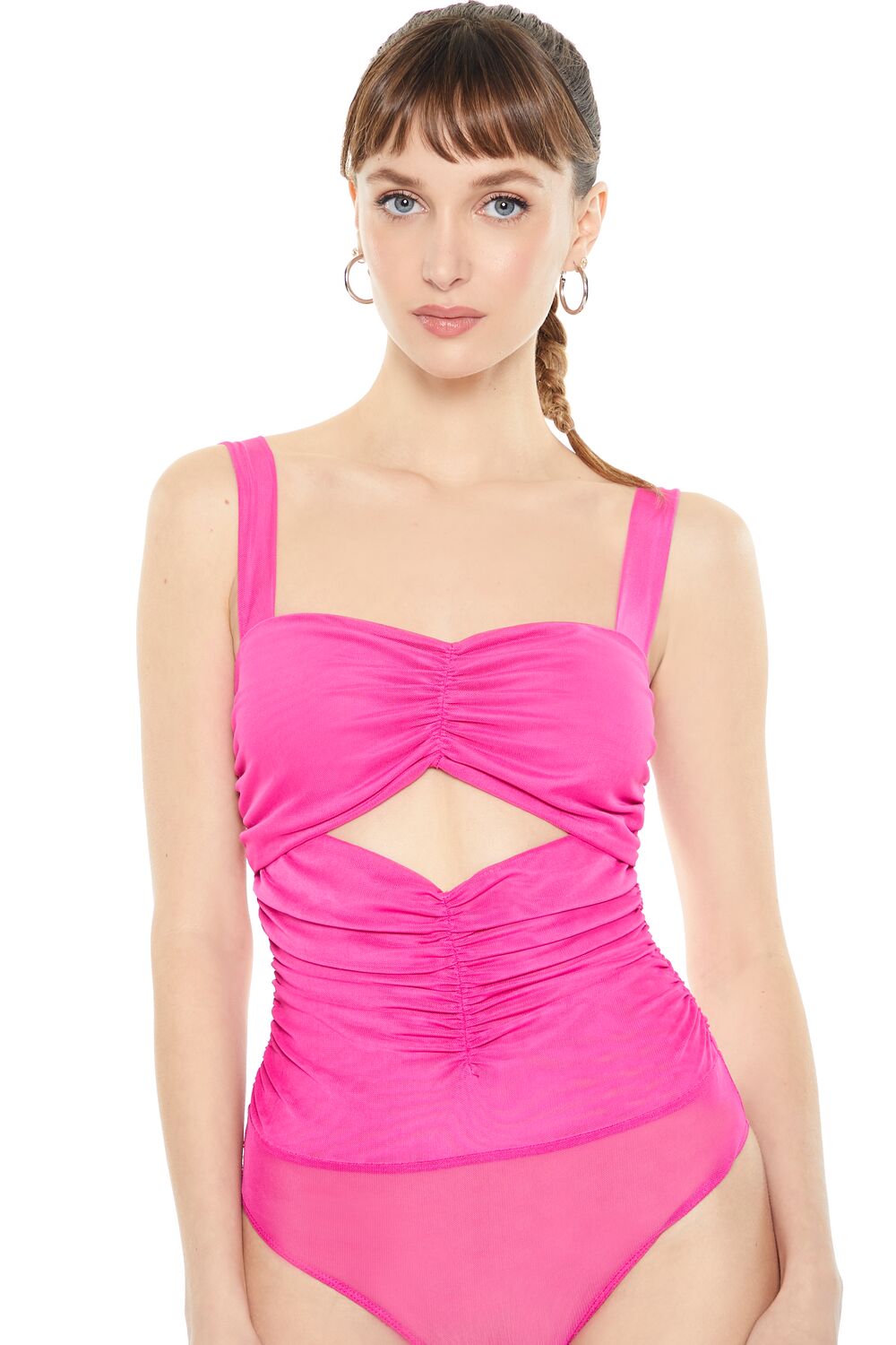 A mesh knit bodysuit featuring a sweetheart neckline. shoulder straps. front and back ruching. front cutout. and a square-cut back.