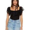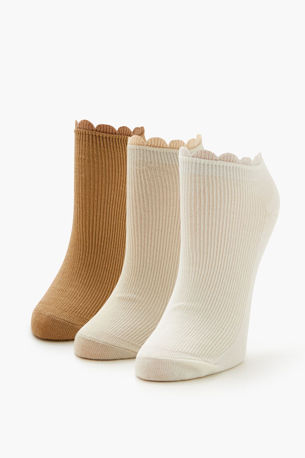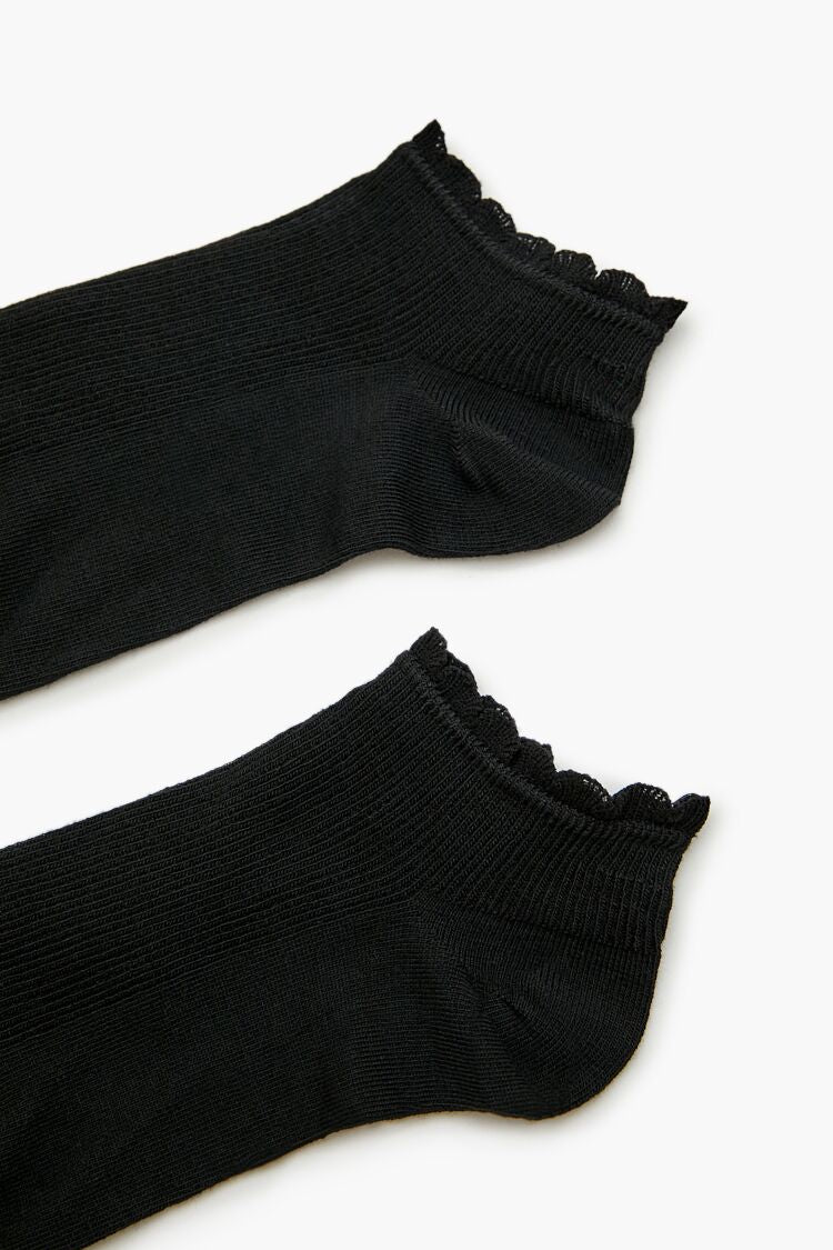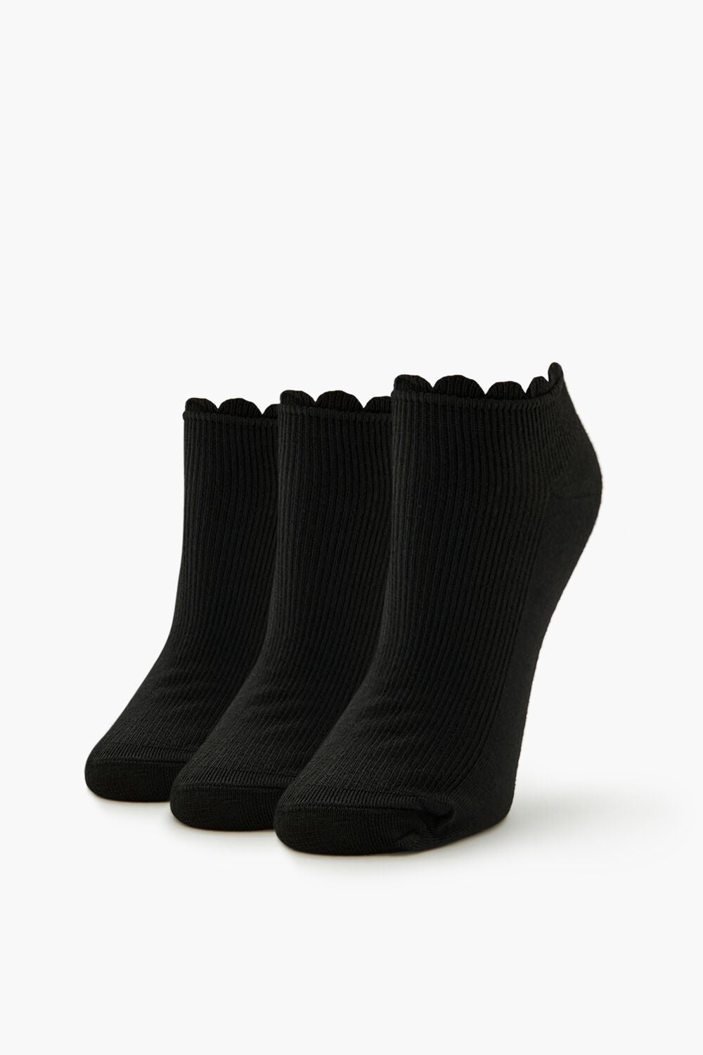 A set of ribbed knit ankle socks featuring scalloped ruffle trim.