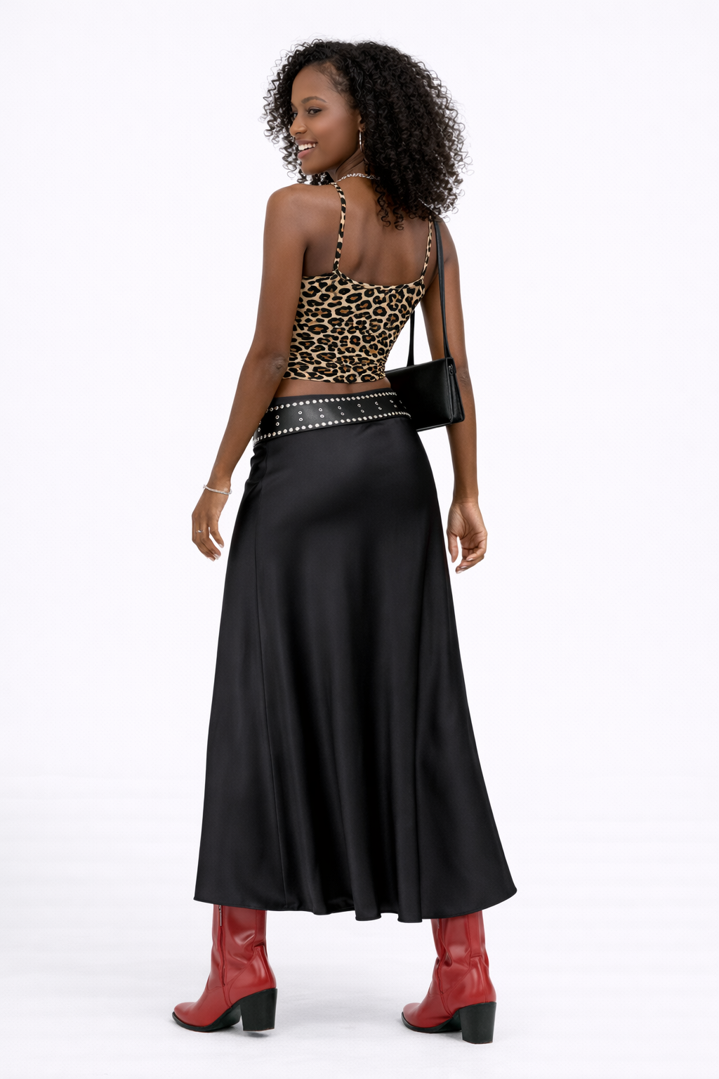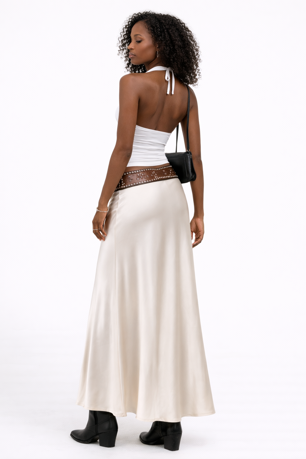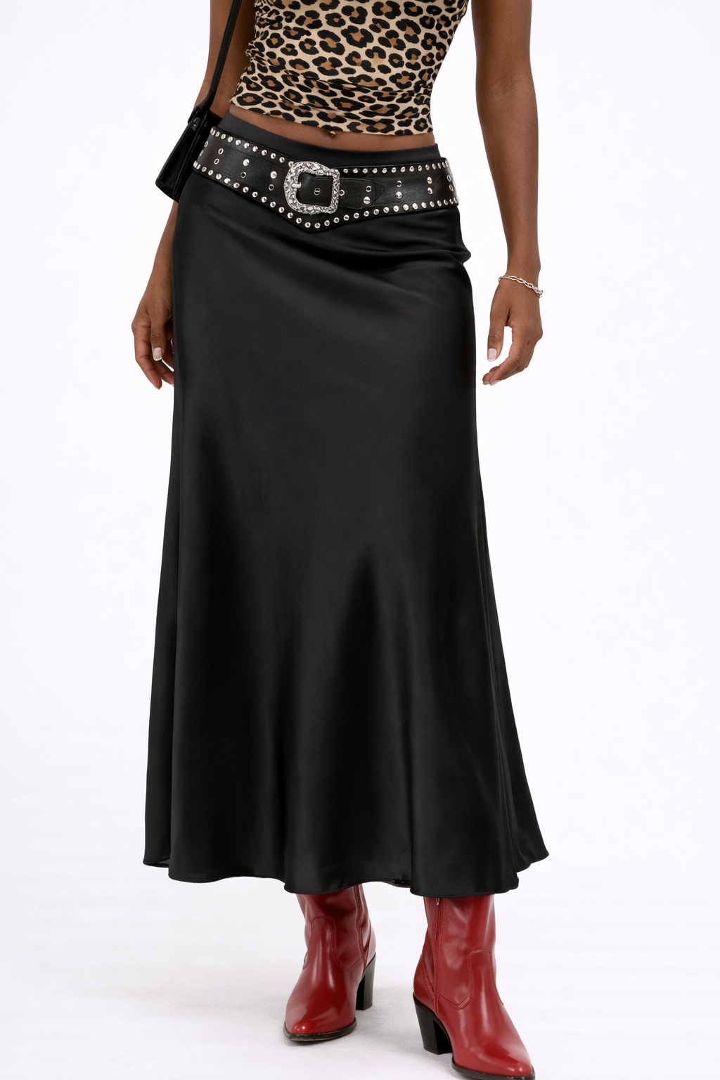 Sleek satin maxi skirt with a smooth. lustrous finish