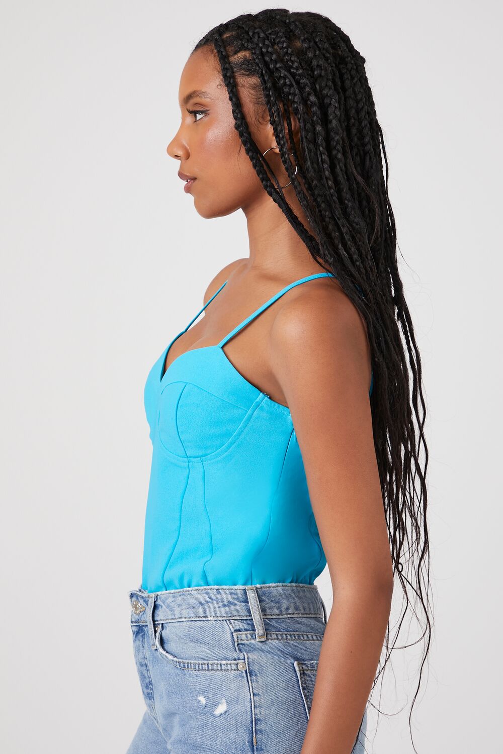 A satin bodysuit featuring a bustier design. plunging sweetheart neckline. straight-cut back. and adjustable cami straps.