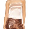 A satin crop top featuring an allover floral print. sweetheart neckline. bustier inspired design. short puff sleeves. and square-cut back with smocked panel.