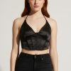 A satin crop top featuring a halter neckline. princess seams. and open back.