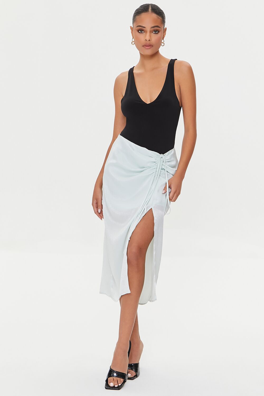 A satin skirt featuring a front ruched drawstring. straight silhouette. and a leg slit.