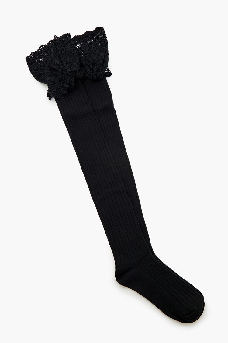 A pair of ribbed knit thigh-high socks featuring scalloped lace trim.