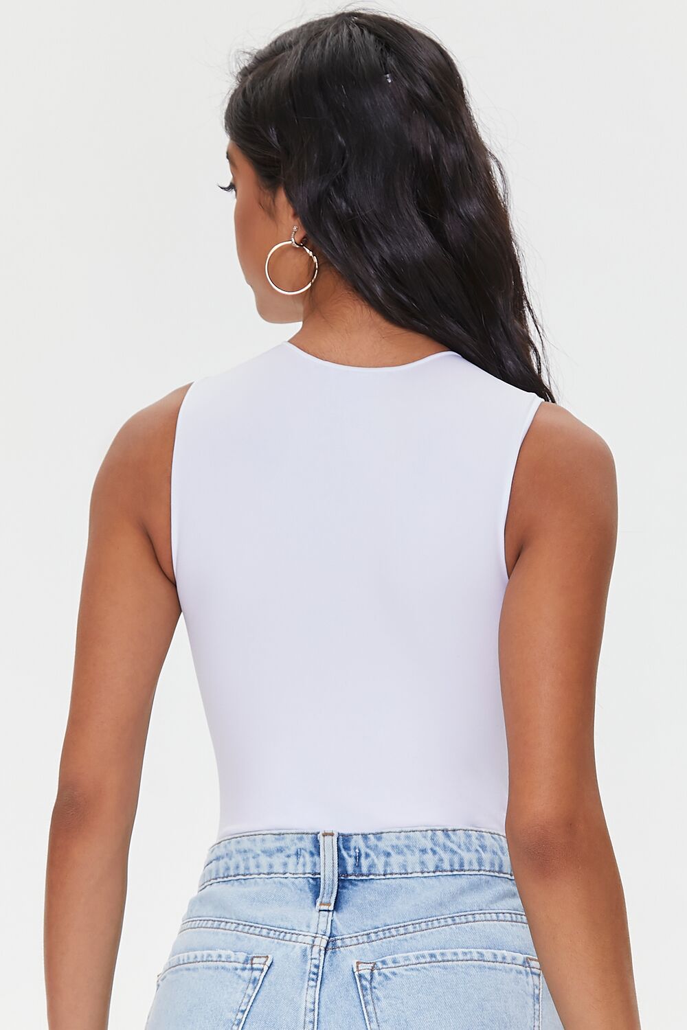 A seamless knit bodysuit featuring a round neckline. sleeveless cut. and a high-leg cut with snap-button closures.