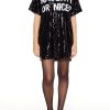 A knit mini dress featuring allover sequin embellishments. a plunging V-neckline. long dolman sleeves. concealed back zipper. and bodycon silhouette.