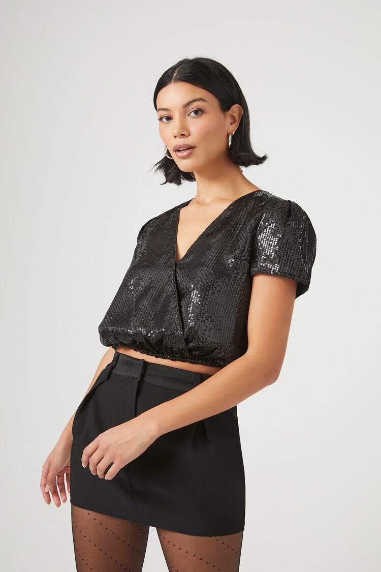 A woven crop top featuring allover sequin embellishments. surplice neckline. short puff sleeves. and elasticized trim.