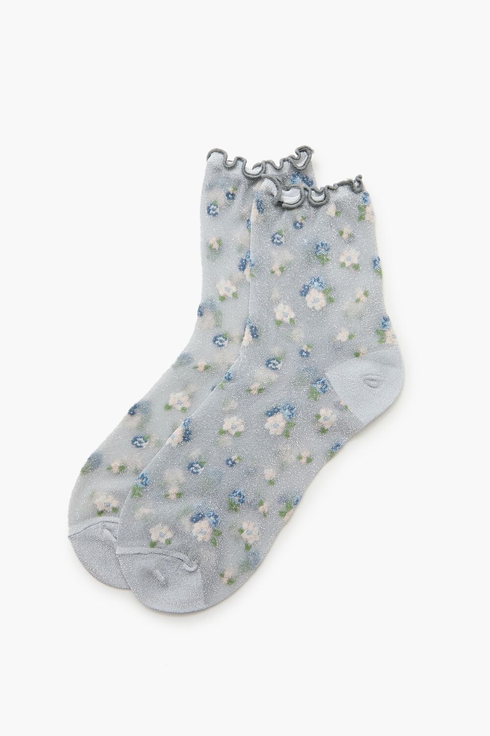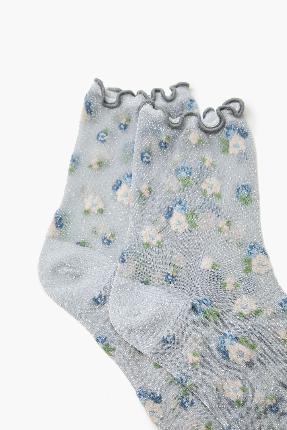 A pair of sheer mesh socks featuring a quarter length. lettuce-edge trim. and allover floral pattern.