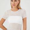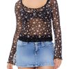 A mesh knit cami featuring a partial sheer construction. front rhinestone details. plunging V-neckline. adjustable straps. and a shirred bust.