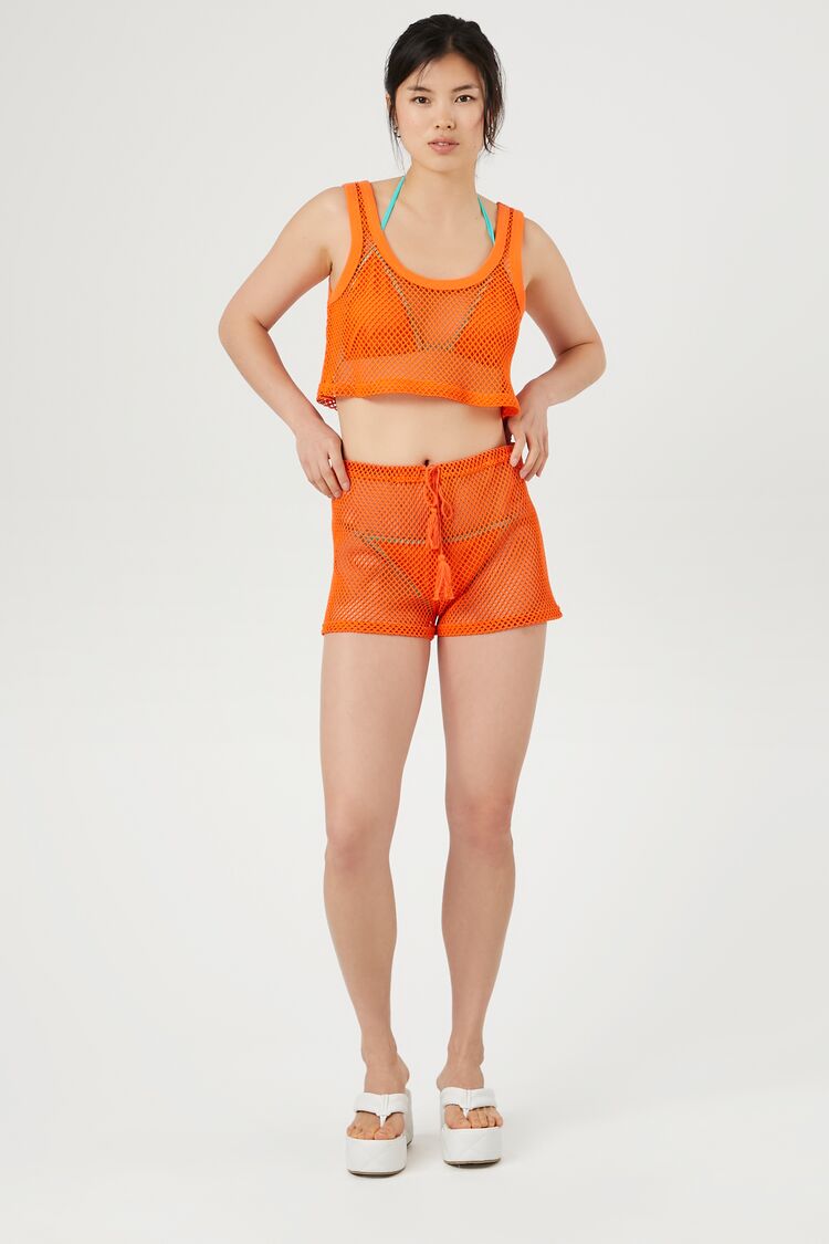 A cotton knit tank top featuring a sheer netted construction. scoop neckline and back. and cropped hem.