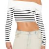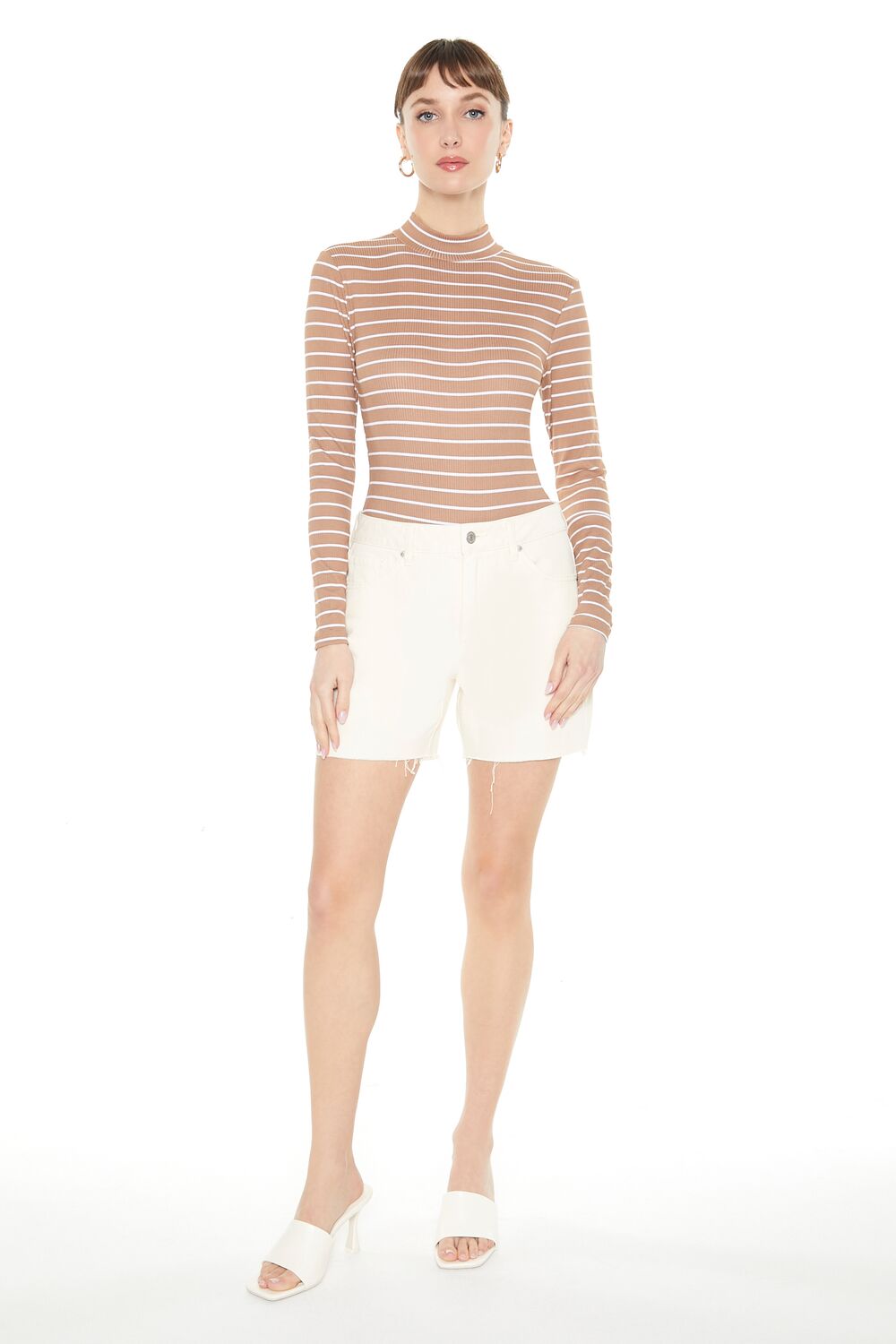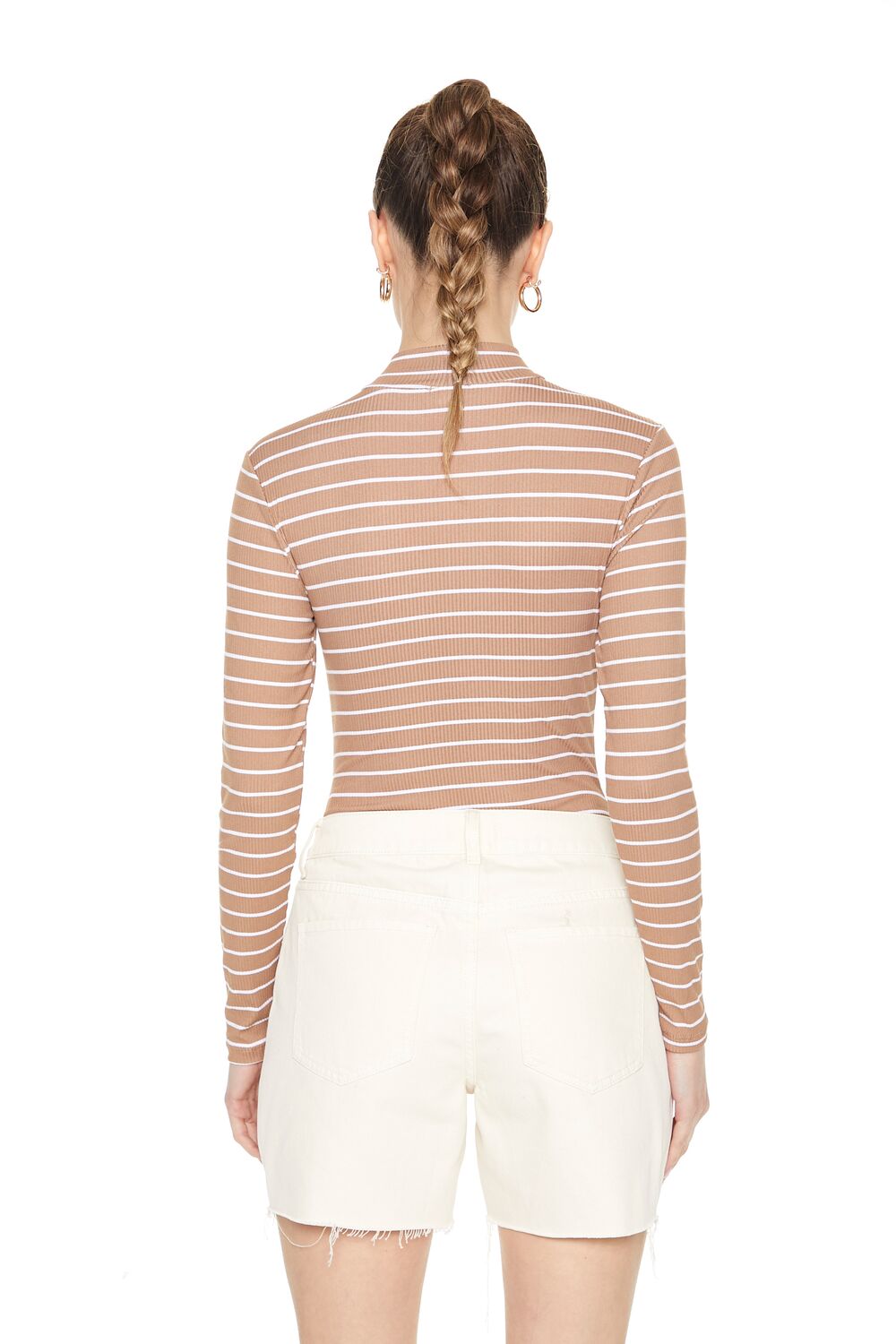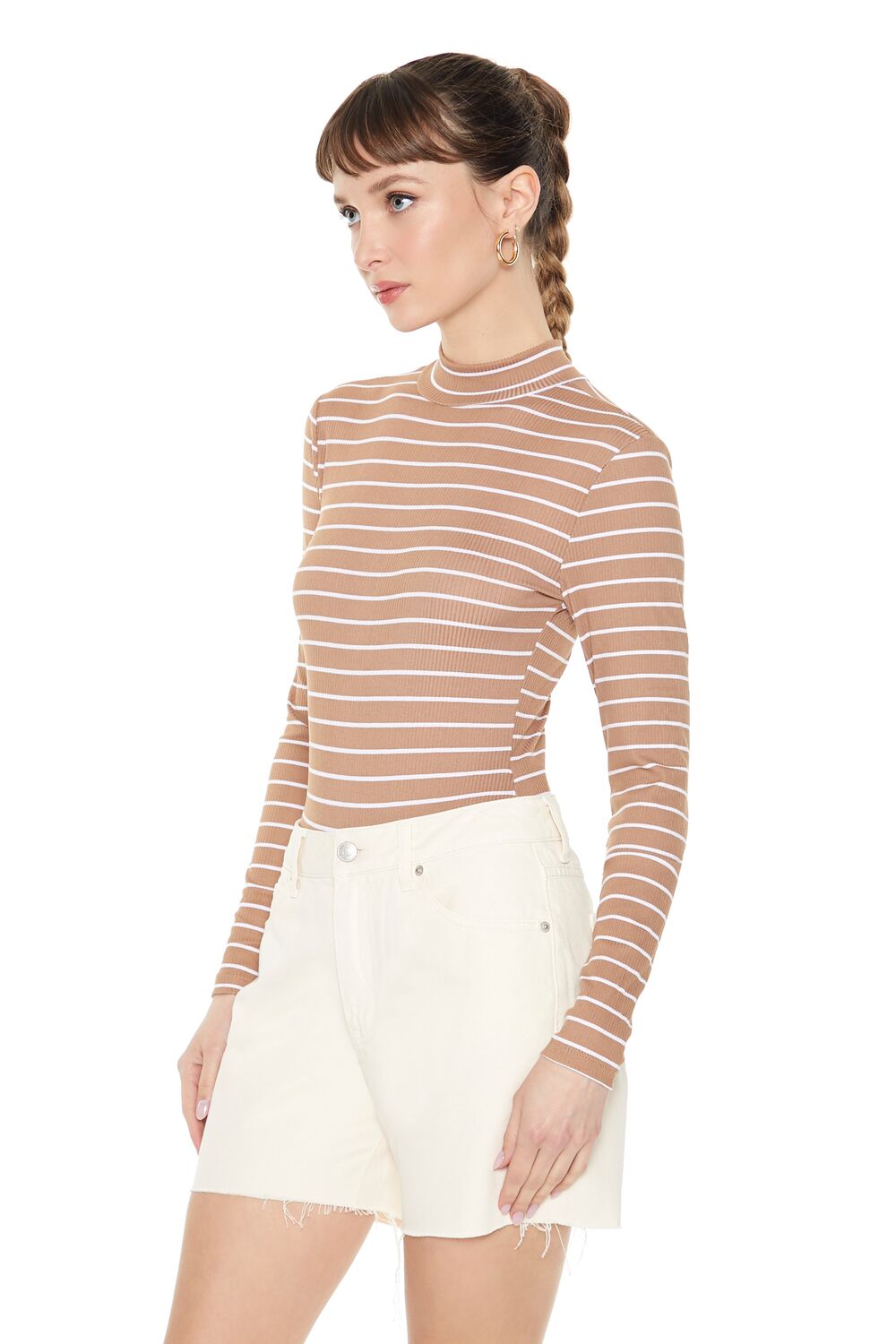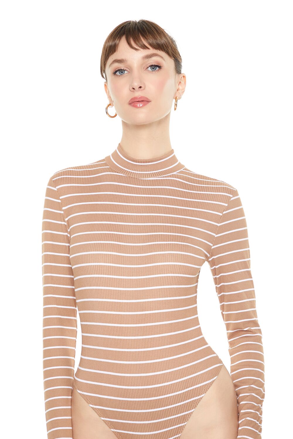 A knit bodysuit featuring an allover pinstriped pattern. long sleeves. and a mock neck.