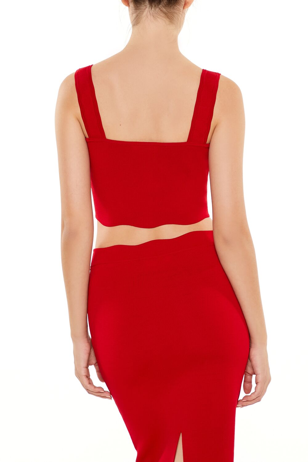 A sweater-knit crop top featuring a bustier-inspired design. square neck and back. shoulder straps. princess seams. and wavy-cut hem.