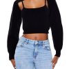 A sweater-knit bodysuit featuring a straight-cut neckline and back. cami straps. self-tie front closures. and high-shine front embellishments.
