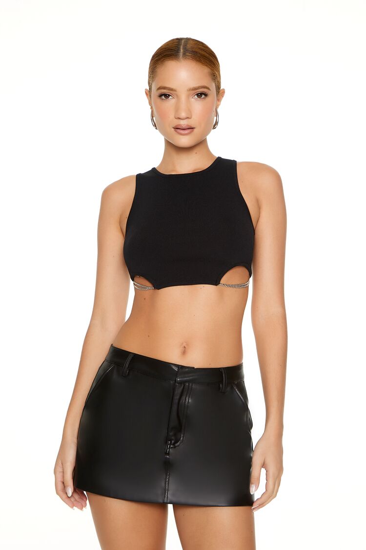 A sweater-knit crop top featuring a round neckline. sleeveless cut. front cutouts. and layered rhinestone box chains.