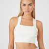 A sweater-knit crop top featuring a crisscross neckline and back. sleeveless cut. and an allover ribbed construction.