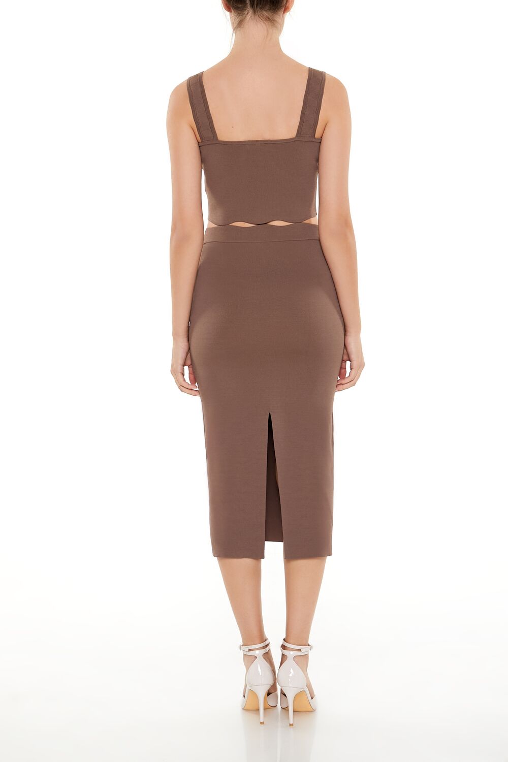 A sweater-knit midi skirt featuring a wavy-cut mid-rise waist. back split hem. and fitted silhouette.