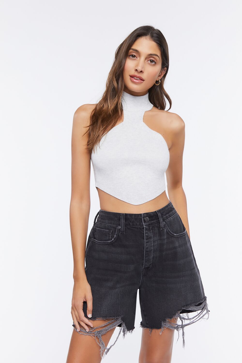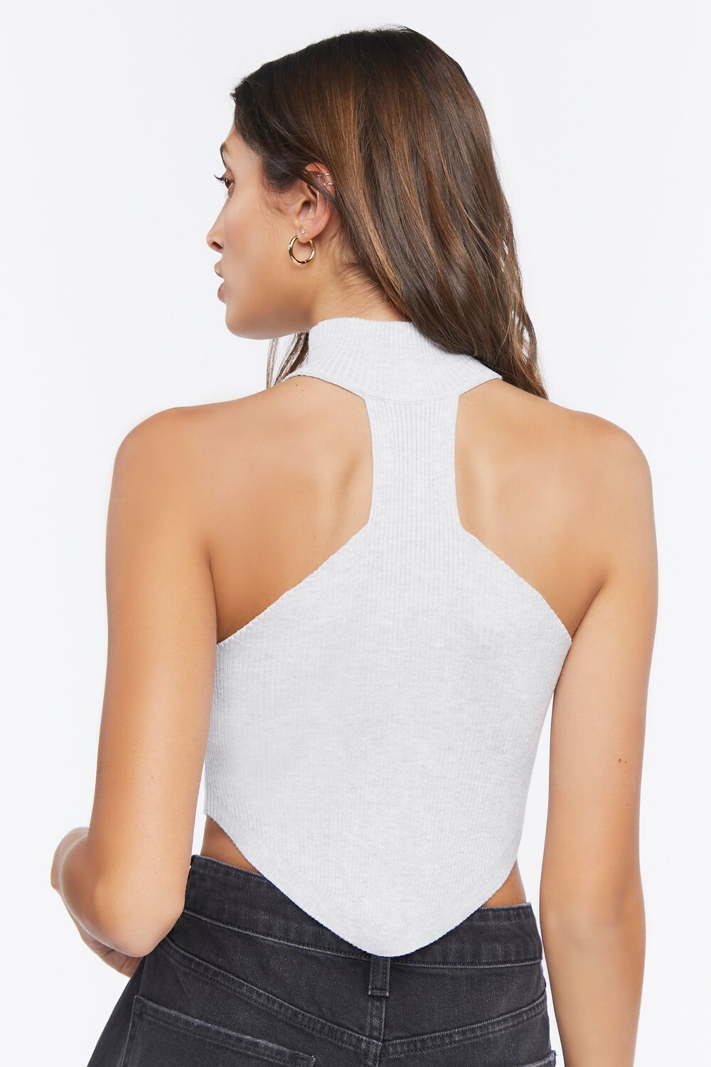A ribbed sweater-knit crop top featuring a mock neck. sleeveless open-shoulder design. racerback. and cropped V-hem.