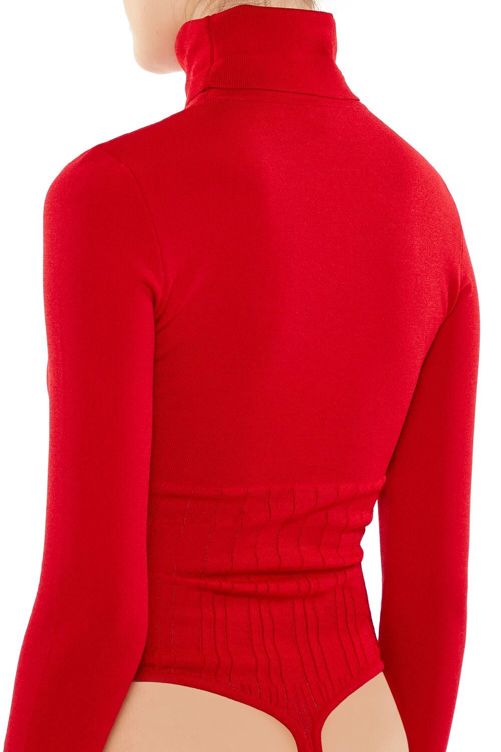 A sweater-knit bodysuit featuring a turtleneck. long sleeves. and thong cut.