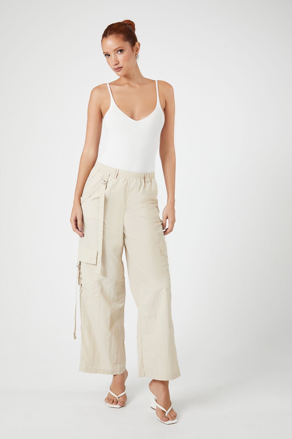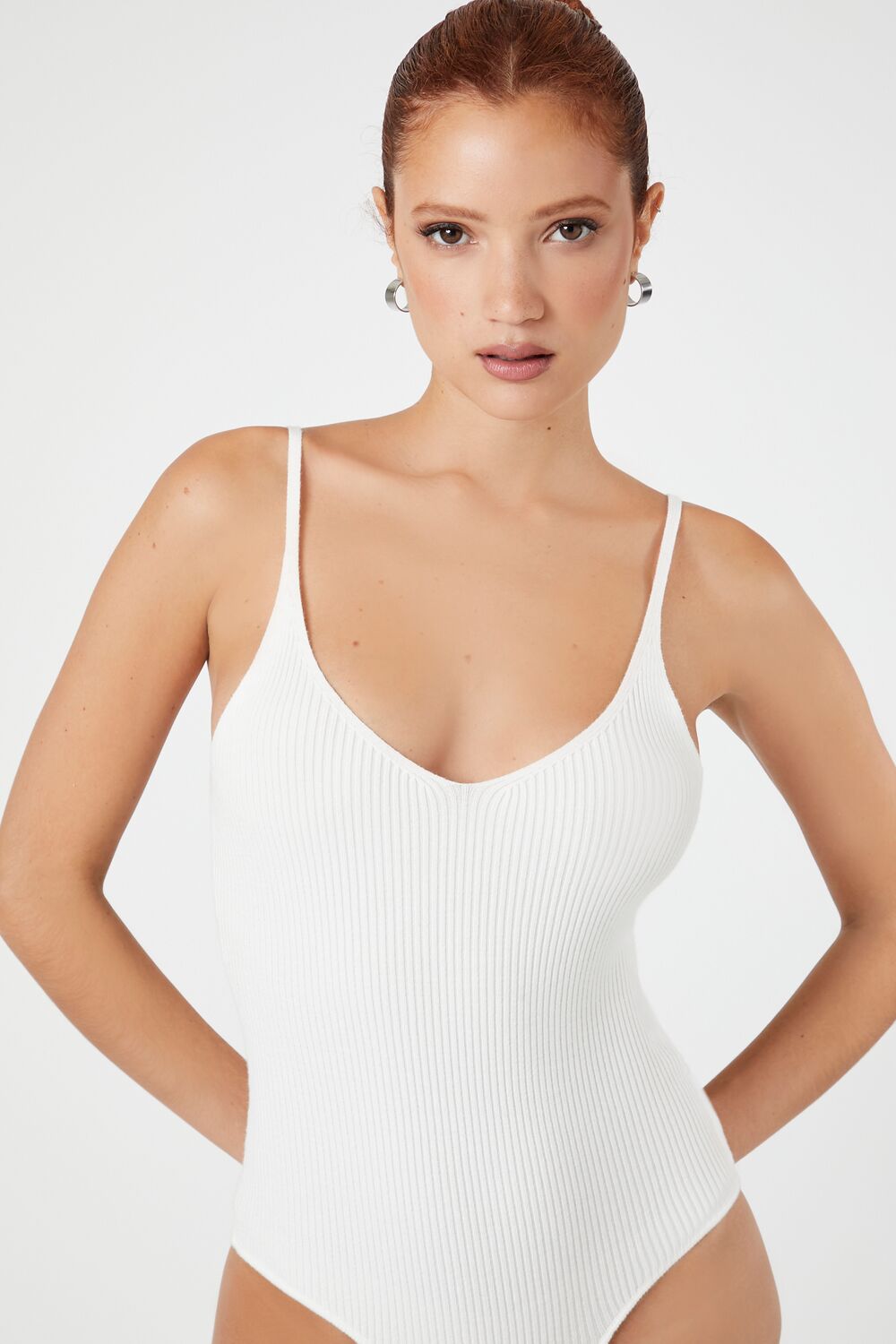 A sweater-knit bodysuit featuring a V-neckline. fixed cami straps. and a scoop back.