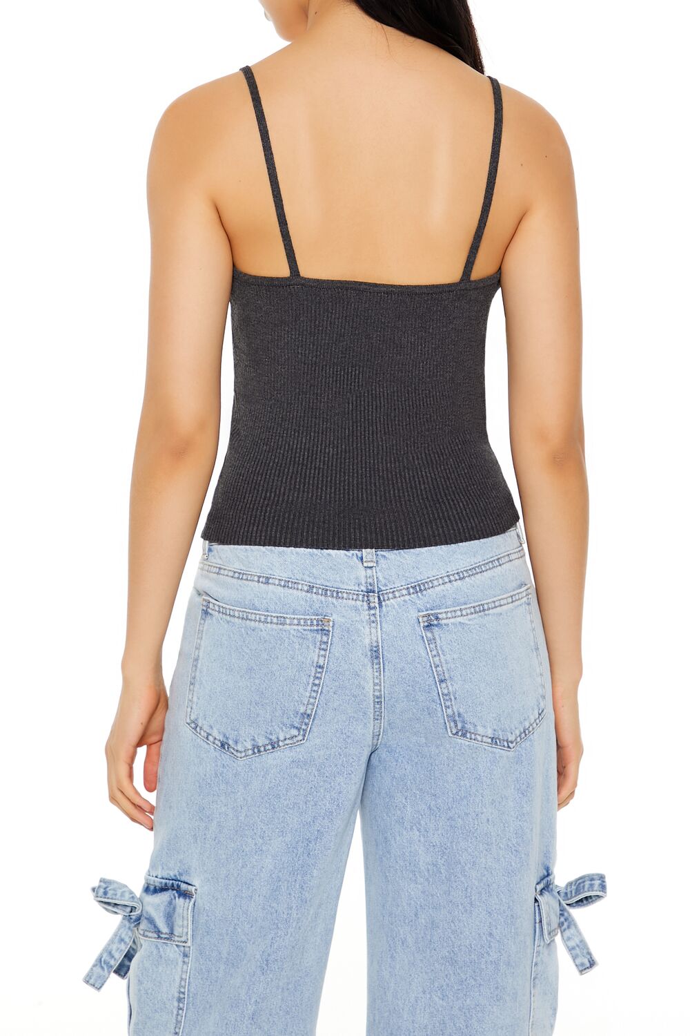 A sweater-knit cami featuring an allover ribbed construction. V-neckline. and fixed straps.
