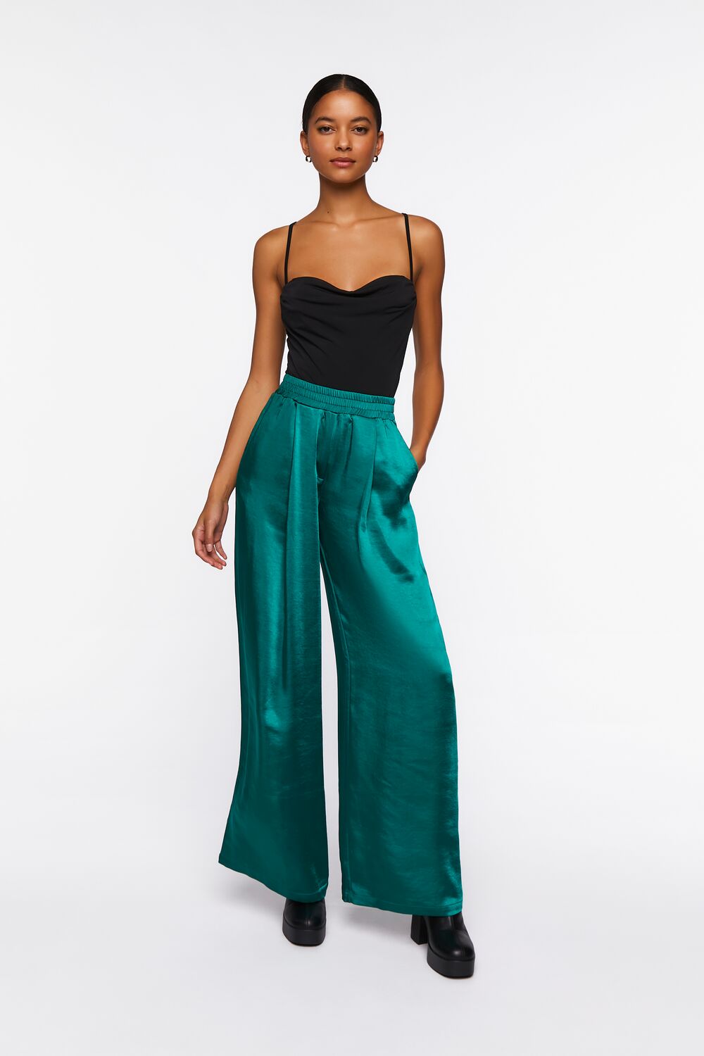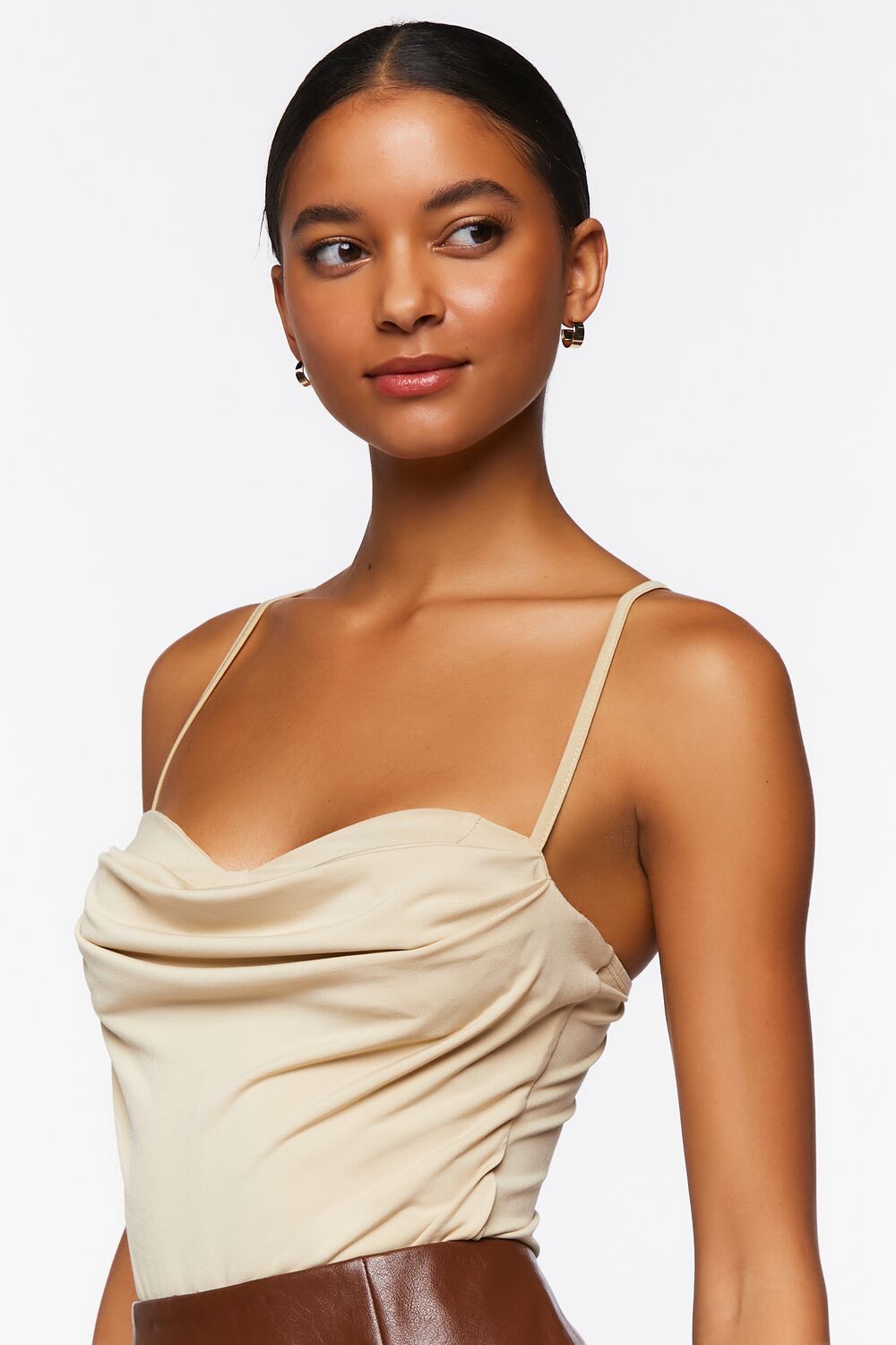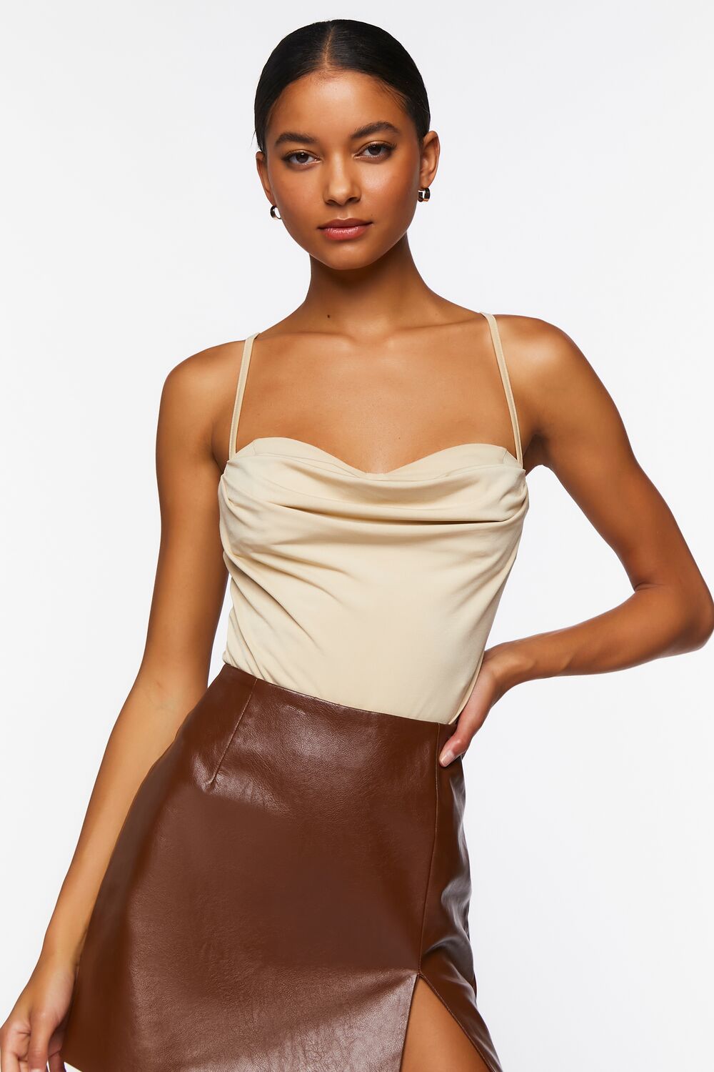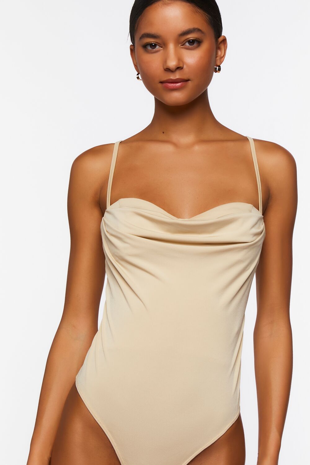 A knit bodysuit featuring a draped sweetheart neckline. straight-cut back. adjustable cami straps. snap-button closures. and fitted silhouette.