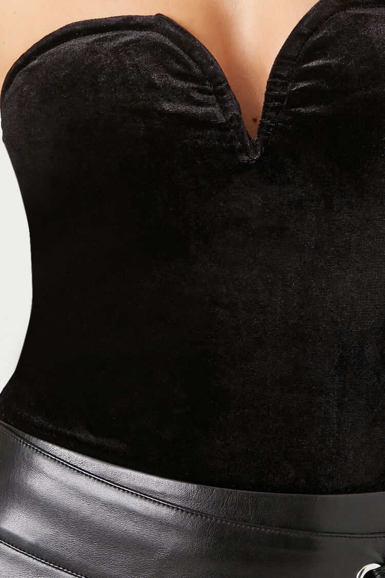 A velvet knit tube bodysuit featuring a sweetheart neckline. strapless cut. and fitted silhouette.