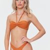 A knit bikini top featuring a V-neckline. low square-cut back. front cutout. knotted bust detail. and shoulder straps.