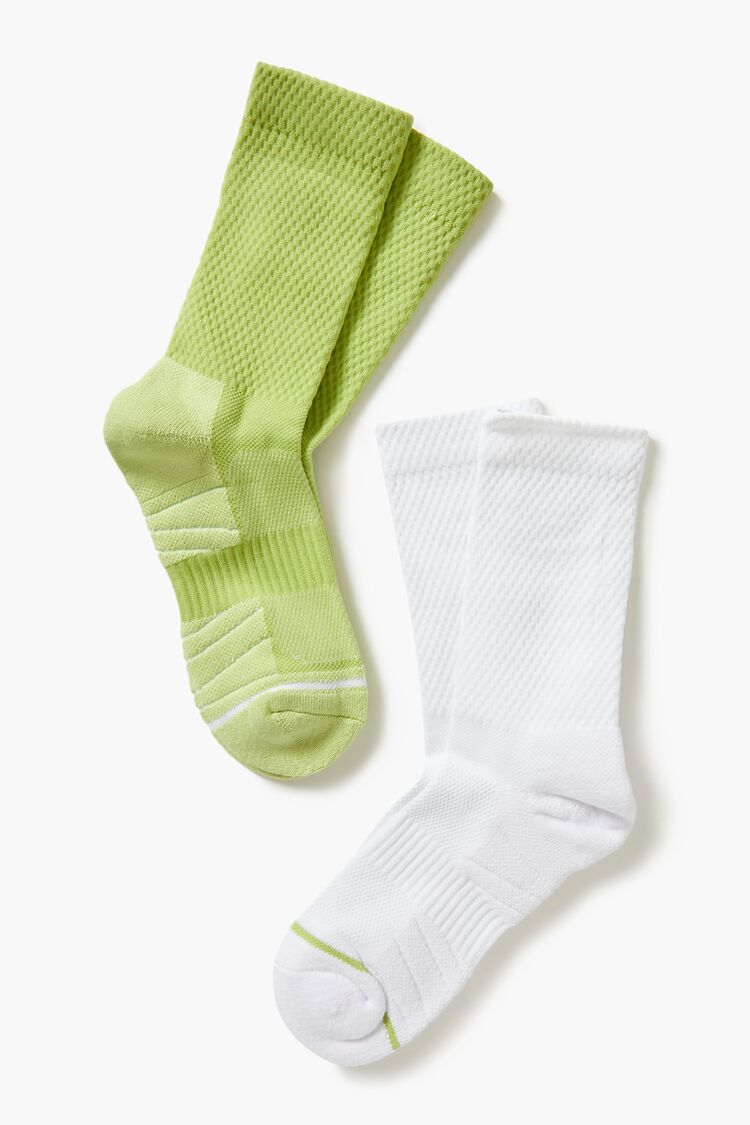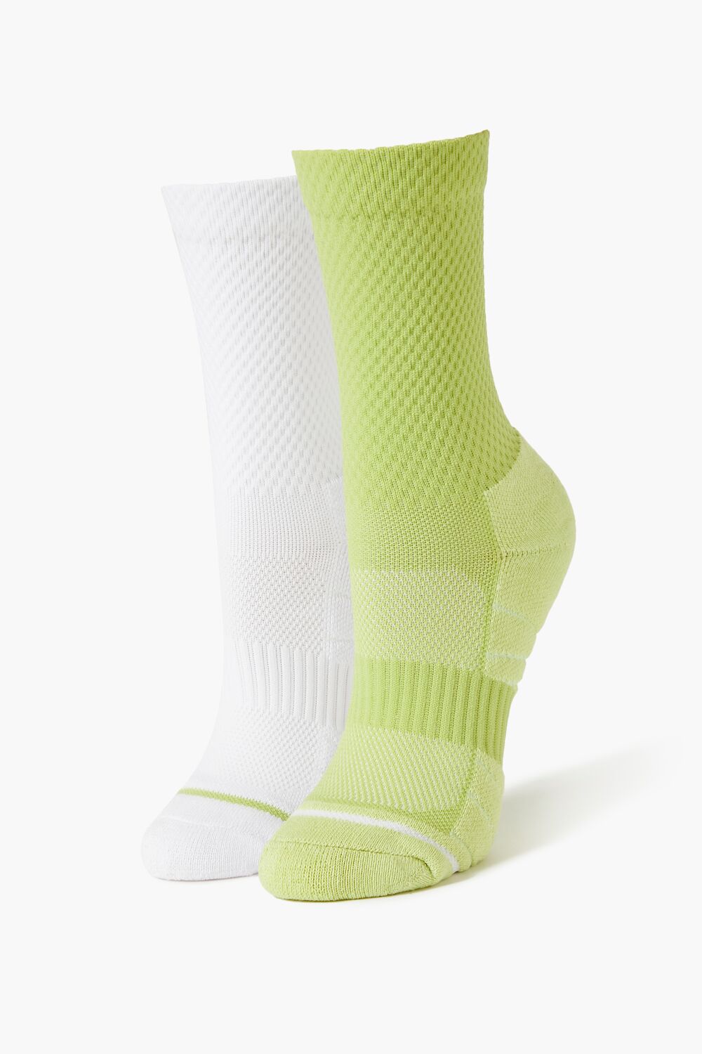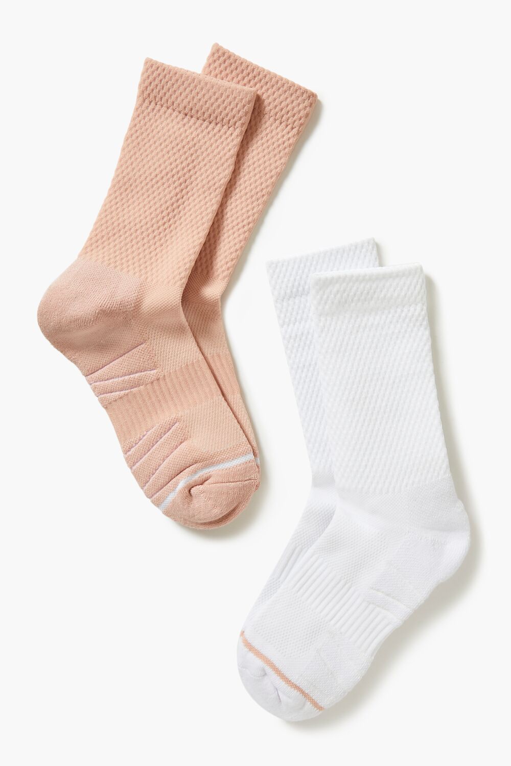 A set of knit crew socks featuring textured construction and contrasting striped trim.