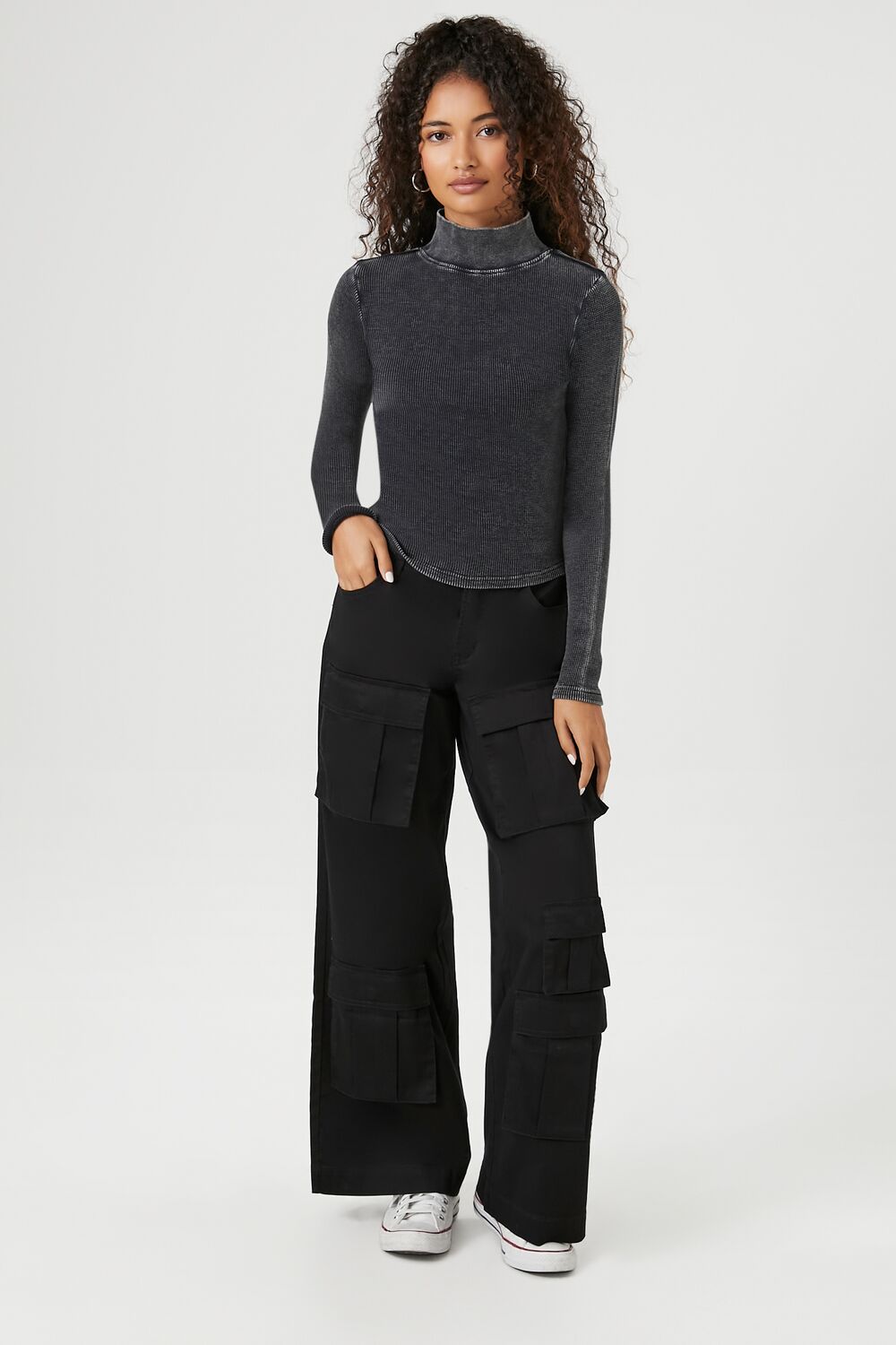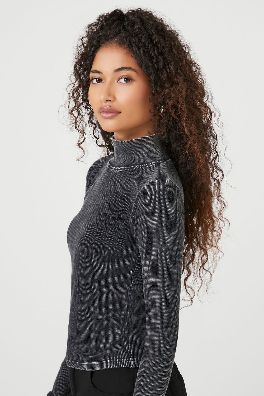 A waffle knit top featuring a turtleneck. long sleeves. and an allover mineral wash.
