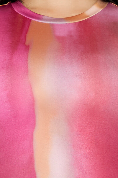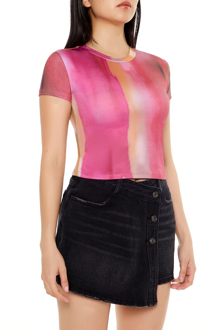 A knit tee featuring an abstract watercolor wash. short sleeves. and a crew neck.